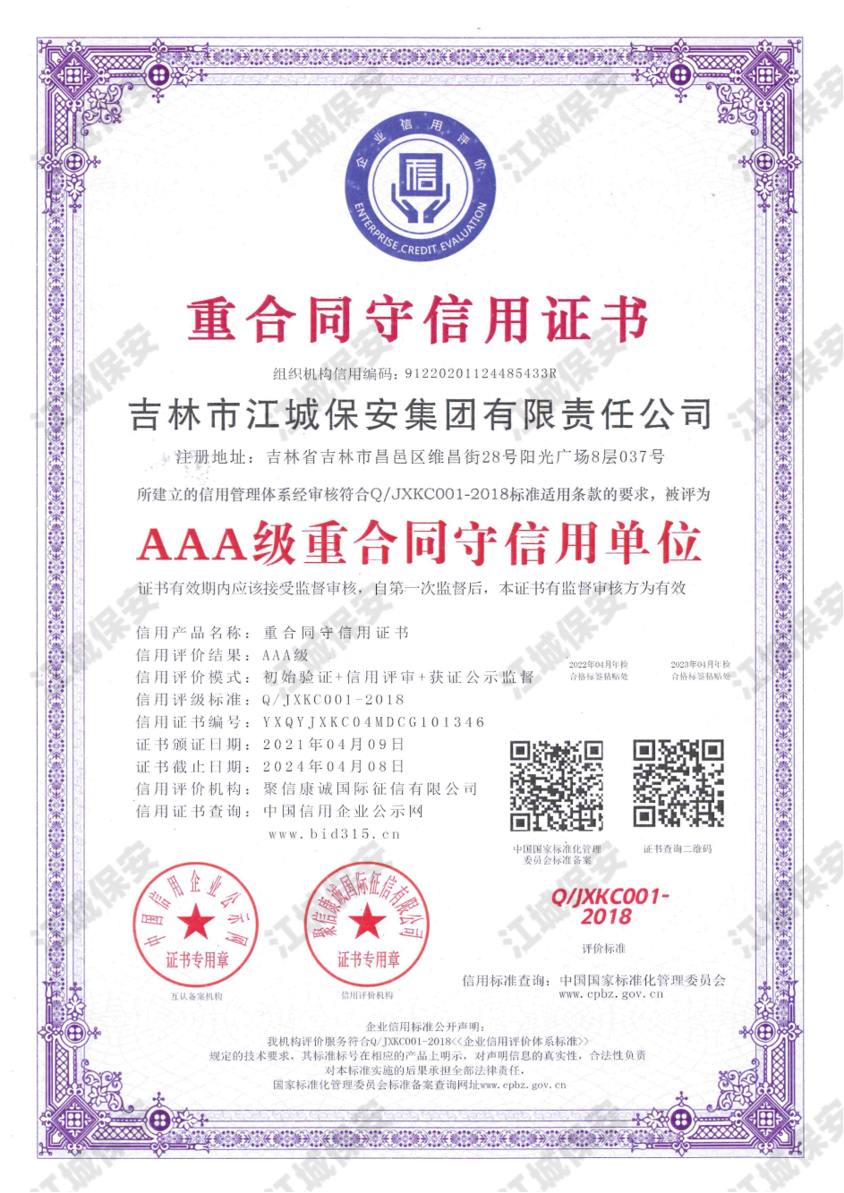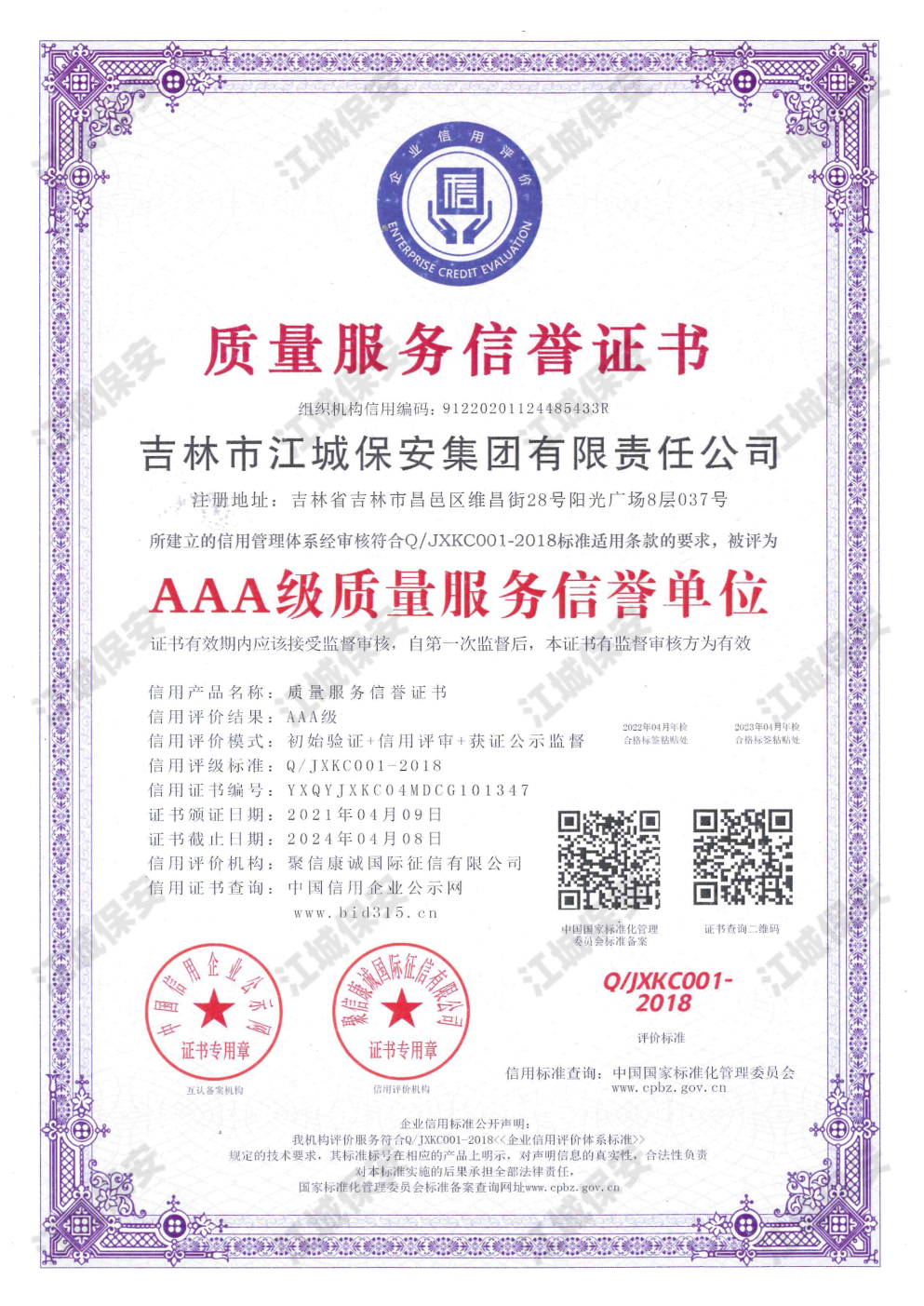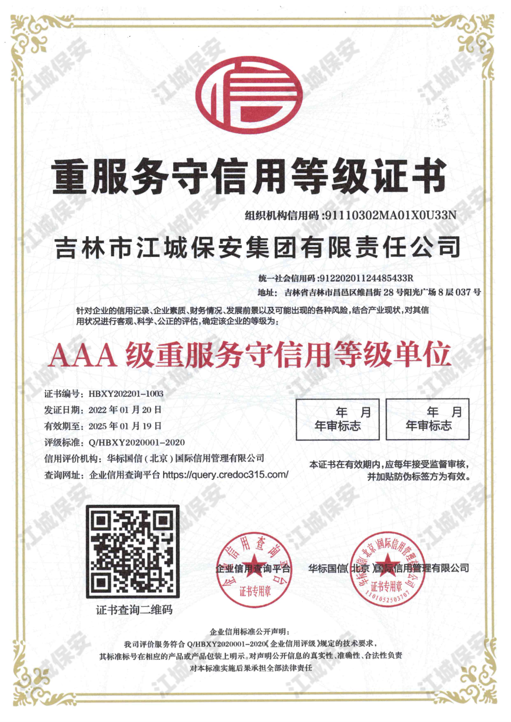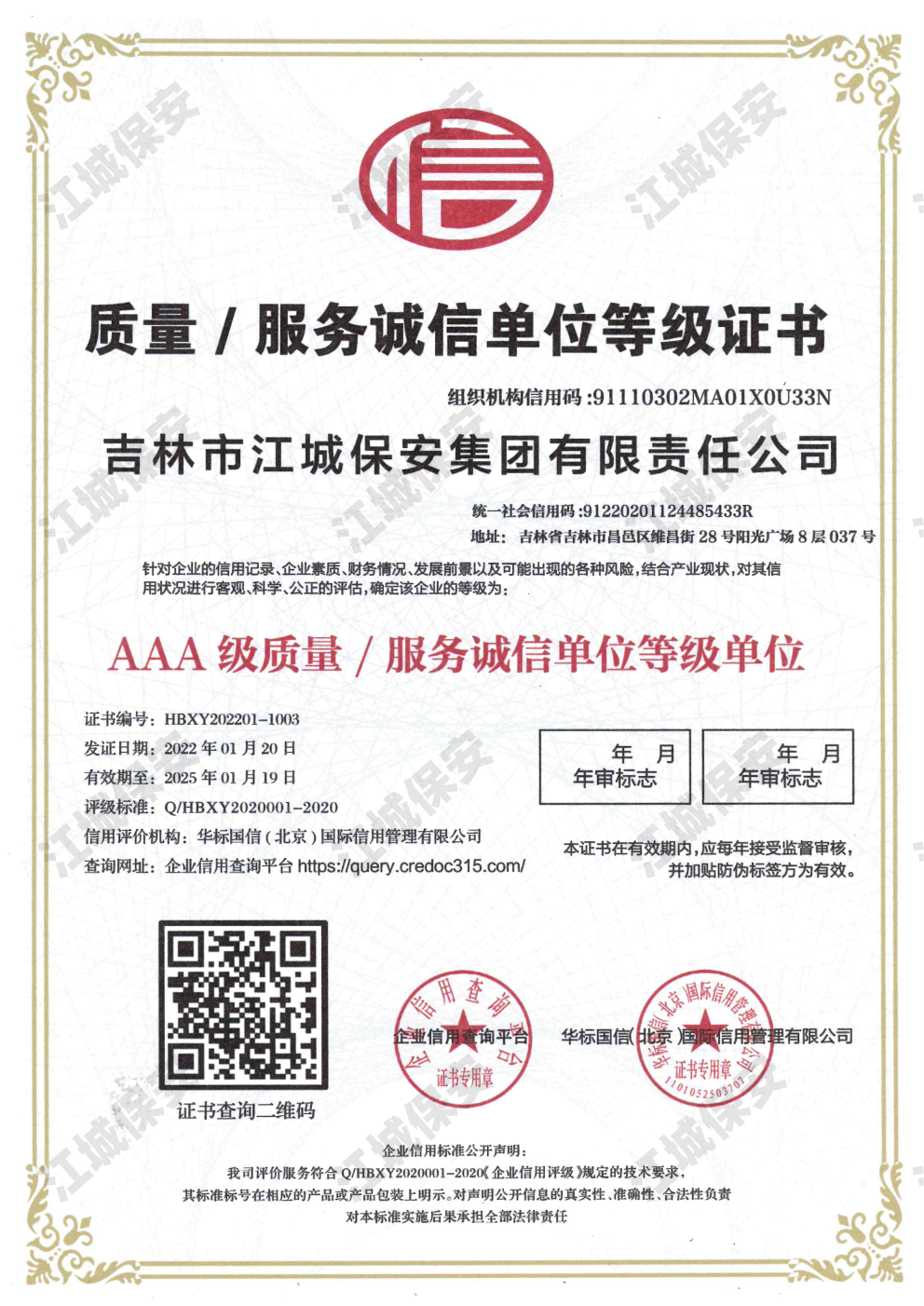 • AAA級質量服務信譽證書